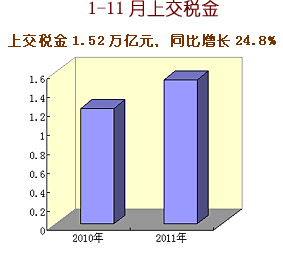 2011年中央企業認真貫徹落實黨中央、國務院各項決策部署,生產經營總體上保持平穩較快增長,主要經濟指標創歷史新高。1-11月,累計實現營業收入18.4萬億元,同比增長22.6%;累計實現凈利潤8317.9億元,同比增長3.6%;上交稅金1.52萬億元,同比增長24.8%,增速比營業收入高2.2個百分點,比凈利潤高21.2個百分點;截至11月底,中央企業資產總額達到27.8萬億元,同比增長16.5%;凈資產10.5萬億元,同比增長12.8%。