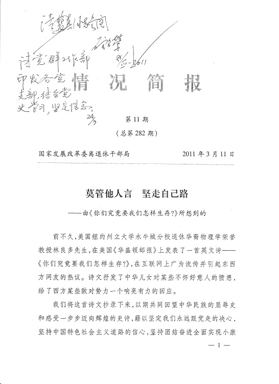 莫管他人言堅走自己路 編者按:國家發改委離退休干部局《情況簡報》今年第11期刊載《莫管他人言堅走自己路——由〈你們究竟要我們怎樣生存?〉所想到的》,是一篇洋溢著愛國主義情懷的好詩文,現根據公司領導的指示予以轉載,請各支部作為黨史學習的生動教材,激發全體同志堅定永遠跟著黨走的決心,堅持走中國特色社會主義道路,為全面實現小康社會而努力奮斗。