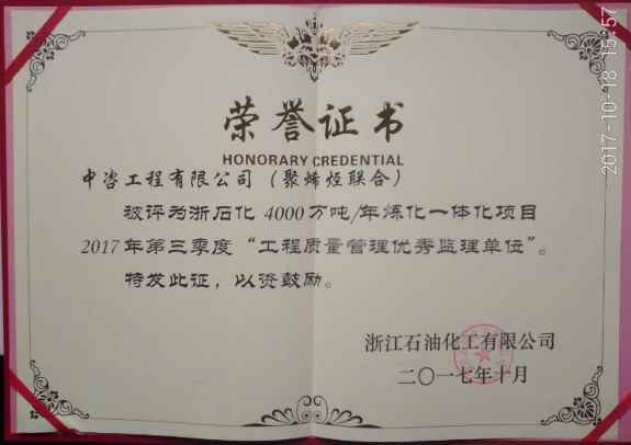 2017年10月,中咨工程有限公司浙石化聚烯烴聯(lián)合監(jiān)理部被業(yè)主浙江石油化工有限公司評為浙石化4000萬噸/年煉化一體化項目2017年第三季度“工程質(zhì)量管理優(yōu)秀監(jiān)理單位”。