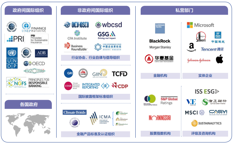 ESG理念和投資原則的迅速傳播和應(yīng)用,關(guān)鍵在于政府間國際組織、非政府間國際組織、公共部門和企業(yè)等多元主體共同參與。聯(lián)合國系統(tǒng)的13家機(jī)構(gòu)或倡議組織(包括UNCTAD、ITC、UNDP、UNEP、WBG、IFC、IMF、UN SSE、UNEP FI、PRI、PSI、PRB、UNGC 等),經(jīng)濟(jì)合作與發(fā)展組織(OECD)、二十國集團(tuán)(G20)等重要的國際多邊合作組織,都積極推動(dòng)ESG政策的制定實(shí)行,以亞洲開發(fā)銀行(ADB)為代表的各地區(qū)開發(fā)銀行也紛紛加強(qiáng)對可持續(xù)領(lǐng)域的項(xiàng)目投資力度,推動(dòng)地區(qū)可持續(xù)發(fā)展目標(biāo)的實(shí)現(xiàn)。在各類國際組織、政府監(jiān)管部門、金融機(jī)構(gòu)和實(shí)體企業(yè)等共同推動(dòng)下,ESG逐漸走向標(biāo)準(zhǔn)化、國際化、體系化、全面化,成為了國際資本市場的一種“新規(guī)則”。