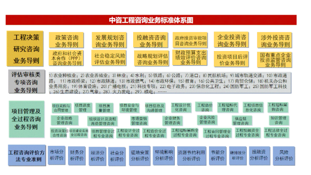 深化工程咨詢理論方法創(chuàng)新研究 構建工程咨詢業(yè)務規(guī)范標準體系 中國國際工程咨詢有限公司 研究中心黨支部 標準化是國家現代化的重要基石,沒有標準化就沒有現代化,更沒有高質量發(fā)展。習近平總書記在中國共產黨第二十次全國代表大會上莊嚴宣告:“從現在起,中國共產黨的中心任務就是團結帶領全國各族人民全面建成社會主義現代化強國、實現第二個百年奮斗目標,以中國式現代化全面推進中華民族偉大復興?!敝袊浆F代化是堅持人民至上、堅持自信自立、堅持守正創(chuàng)新、堅持問題導向、堅持系統(tǒng)觀念、堅持胸懷天下的現代化,是立足新發(fā)展階段,完整、準確、全面貫徹新發(fā)展理念,構建新發(fā)展觀格局,實現高質量發(fā)展的現代化,是推進中國標準化事業(yè)高質量發(fā)展不斷取得新成效的現代化。高質量發(fā)展是全面建設社會主義現代化國家的首要任務,也是中咨公司在新時代再出發(fā)、再發(fā)展、再輝煌的必然要求。一流的企業(yè)做標準,二流的企業(yè)做品牌,三流的企業(yè)做產品。中咨公司按照新時代新要求推動工程咨詢理念創(chuàng)新,打造工程咨詢產業(yè)鏈鏈長,創(chuàng)建世界一流咨詢機構,對咨詢業(yè)務規(guī)范標準體系建設提出了更高要求。根據中咨公司建設國家高端智庫和世界一流咨詢機構戰(zhàn)略規(guī)劃目標要求,研究新時代中咨公司如何推動工程咨詢理論方法體系創(chuàng)新,構建符合工程咨詢產業(yè)鏈鏈長和世界一流咨詢機構使命要求的工程咨詢業(yè)務規(guī)范標準體系,是公司結合自身實際深入學習貫徹黨的二十大精神必須深入研究的重大課題。 一、研究制定標準體系是高質量發(fā)展的必然要求 (一)標準化是實現經濟社會高質量發(fā)展的必然要求 1.高質量發(fā)展需要標準化提供支撐 “標準是人類文明進步的成果”。習近平總書記在慶祝第39屆國際標準化組織(ISO)大會召開的賀信中指出:“從中國古代的‘車同軌、書同文’,到現代工業(yè)規(guī)?;a,都是標準化的生動實踐。伴隨著經濟全球化深入發(fā)展,標準化在便利經貿往來、支撐產業(yè)發(fā)展、促進科技進步、規(guī)范社會治理中的作用日益凸顯。標準已成為世界‘通用語言’。世界需要標準協(xié)同發(fā)展,標準促進世界互聯(lián)互通。” 新中國成立以來,我國標準化事業(yè)經歷了從起步探索、開放發(fā)展到全面提升的光輝歷程,標準供給更加多元高效,標準體系日趨完善,標準技術水平和國際化程度明顯提升,標準化效益不斷顯現,全社會標準化意識持續(xù)增強。與此同時,我國標準化還存在標準有效供給不足、標準實施應用不夠、標準國際化水平亟待提高等問題。在新發(fā)展階段,以習近平新時代中國特色社會主義思想為指導,更應深入學習領會習近平總書記“標準助推創(chuàng)新發(fā)展,標準引領時代進步”的重要論斷,強調只有高標準才有高質量,沒有高標準就沒有現代化,要將新發(fā)展理念貫徹到標準化工作的各個環(huán)節(jié)和所有方面,充分發(fā)揮標準在引領高質量發(fā)展和推動實現中國式現代化偉大事業(yè)中的重要作用。 2.標準化建設應以高質量發(fā)展為目標導向 黨的二十大報告強調在推動中國式現代化建設的偉大事業(yè)中,要“加快構建新發(fā)展格局,著力推動高質量發(fā)展”。在實現高質量發(fā)展的具體行動中,無論是完整、準確、全面貫徹新發(fā)展理念,還是著力構建高水平社會主義市場經濟體制,建設現代化產業(yè)體系,全面推進鄉(xiāng)村振興,促進區(qū)域協(xié)調發(fā)展,推進高水平對外開放,都需要高質量的標準體系來提供支撐保障。習近平總書記強調,“中國將積極實施標準化戰(zhàn)略,以標準助力創(chuàng)新發(fā)展、協(xié)調發(fā)展、綠色發(fā)展、開放發(fā)展、共享發(fā)展”。新時代要更加深刻理解和認識標準化在國家治理體系和治理能力現代化中的基礎性、引領性作用,處理好政府與市場、繼承與創(chuàng)新、國內與國際之間的關系,優(yōu)化標準化治理結構,增強標準化治理效能,提升標準國際化水平,加快構建推動高質量發(fā)展的標準體系,以高標準助力技術創(chuàng)新、促進高水平開放、引領高質量發(fā)展,為全面建成社會主義現代化強國、實現中華民族偉大復興的中國夢提供有力支撐。 近年來,以習近平同志為核心的黨中央立足國情、放眼全球、面向未來,對我國標準化事業(yè)作出一系列重大部署。我國于2021年制定印發(fā)《國家標準化發(fā)展綱要》,提出到2025年,我國的標準化工作要更加有效地推動國家綜合競爭力提升,促進經濟社會高質量發(fā)展,在構建新發(fā)展格局中發(fā)揮更大作用,實現全領域標準化深度發(fā)展,農業(yè)、工業(yè)、服務業(yè)和社會事業(yè)等領域標準全覆蓋;標準化水平大幅提升,標準化的經濟效益、社會效益、質量效益、生態(tài)效益充分顯現;標準化開放程度顯著增強,國家標準與國際標準關鍵技術指標的一致性程度大幅提升;標準化發(fā)展基礎更加牢固,建成一批國際一流的綜合性、專業(yè)性標準化研究機構。到2035年,要實現標準體系更加健全,標準化管理體制更加完善,市場驅動、政府引導、企業(yè)為主、社會參與、開放融合的標準化工作格局全面