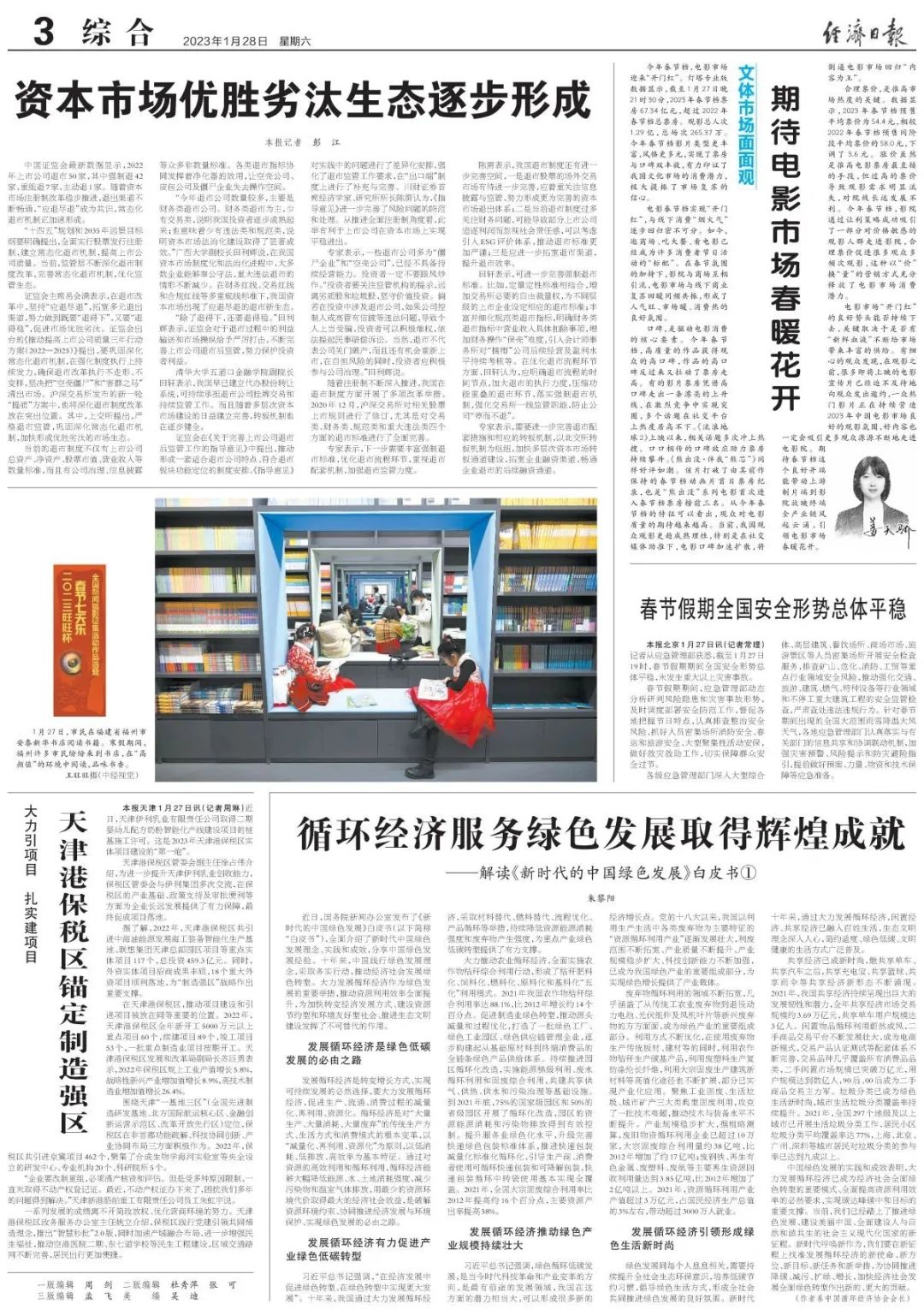循環經濟服務綠色發展取得輝煌成就 ——解讀《新時代的中國綠色發展》白皮書 朱黎陽 近日,國務院新聞辦公室發布了《新時代的中國綠色發展》白皮書(以下簡稱“白皮書”),全面介紹了新時代中國綠色發展理念、實踐和成效,分享中國綠色發展經驗。十年來,中國踐行綠色發展理念,采取務實行動,推動經濟社會發展綠色轉型。大力發展循環經濟作為綠色發展的重要舉措,推動資源利用效率全面提升,為加快轉變經濟發展方式、建設資源節約型和環境友好型社會、推進生態文明建設發揮了不可替代的作用。 01 發展循環經濟是綠色低碳發展的必由之路 發展循環經濟是轉變增長方式、實現可持續發展的必然選擇,要大力發展循環經濟,促進生產、流通、消費過程的減量化、再利用、資源化。循環經濟是對“大量生產、大量消耗、大量廢棄”的傳統生產方式、生活方式和消費模式的根本變革,以“減量化、再利用、資源化”為原則,以低消耗、低排放、高效率為基本特征。通過對資源的高效利用和循環利用,循環經濟能夠大幅降低能源、水、土地消耗強度,減少污染物和溫室氣體排放,用最少的資源環境代價取得最大的經濟社會效益,是破解資源環境約束、協同推進經濟發展與環境保護、實現綠色發展的必由之路。 02 發展循環經濟有力促進產業綠色低碳轉型 習近平總書記強調,“在經濟發展中促進綠色轉型、在綠色轉型中實現更大發展”。十年來,我國通過大力發展循環經濟,采取材料替代、燃料替代、流程優化、產品循環等舉措,持續降低資源能源消耗強度和廢棄物產生強度,為重點產業綠色低碳轉型提供了有力支撐。 大力推動農業循環經濟,全面實施農作物秸稈綜合利用行動,形成了秸稈肥料化、飼料化、燃料化、原料化和基料化“五化”利用模式。2021年我國農作物秸稈綜合利用率達88.1%,比2012年增長約14個百分點。促進制造業綠色轉型,推動源頭減量和過程優化,打造了一批綠色工廠、綠色工業園區、綠色供應鏈管理企業,逐步構建起從基礎原材料到終端消費品的全鏈條綠色產品供給體系。持續推進園區循環化改造,實施能源梯級利用、廢水循環利用和固廢綜合利用,共建共享供氣、供熱、供水和污染治理等基礎設施。到2021年底,75%的國家級園區和50%的省級園區開展了循環化改造,園區的資源能源消耗和污染物排放得到有效控制。提升服務業綠色化水平,升級完善快遞綠色包裝標準體系,推進快遞包裝減量化、標準化、循環化,引導生產商、消費者使用可循環快遞包裝和可降解包裝,快遞包裝循環中轉袋使用基本實現全覆蓋。2021年,全國大宗固廢綜合利用率比2012年提高約16個百分點,主要資源產出率提高58%。 03 發展循環經濟推動綠色產業規模持續壯大 習近平總書記強調,綠色循環低碳發展,是當今時代科技革命和產業變革的方向,是最有前途的發展領域,我國在這方面的潛力相當大,可以形成很多新的經濟增長點。黨的十八大以來,我國以利用生產生活中各類廢棄物為主要特征的“資源循環利用產業”逐漸發展壯大,利廢范圍不斷拓寬、產業質量不斷提升、產業規模穩步擴大、科技創新能力不斷加強,已成為我國綠色產業的重要組成部分,為實現綠色增長提供了產業載體。 廢棄物循環利用的領域不斷拓寬,幾乎涵蓋了從傳統工農業廢棄物到退役動力電池、光伏組件及風機葉片等新興廢棄物的方方面面,成為綠色產業的重要組成部分。利用方式不斷優化,在使用廢棄物生產傳統板材、建材等的同時,利用農作物秸稈生產碳基產品,利用廢塑料生產復紡滌綸長纖維,利用大宗固廢生產建筑新材料等高值化途徑也不斷擴展,部分已實現產業化應用。聚焦工業固廢、生活垃圾、城市礦產三大類典型固廢利用,攻克了一批技術難題,推動技術與裝備水平不斷提升。產業規模穩步擴大,據粗略測算,廢舊物資循環利用企業已超過10萬家,大宗固廢綜合利用量約38億噸,比2012年增加了約17億噸;廢鋼鐵、再生有色金屬、廢塑料、廢紙等主要再生資源回收利用量達到3.85億噸,比2012年增加了2億噸以上。2021年,資源循環利用產業產值超過3萬億元,占國民生產總值的3%左右,帶動超過3000萬人就業。 04 發展循環經濟引領形成綠色生活新時尚 綠色發展同每個人息息相關,需要持續提升全社會生態環保意識,培養低碳節約習慣,倡導綠色生活方式,形成全社會共同推進綠色發展的良好氛圍。新時代十年來,通過大力發展循環經濟,閑置經濟、共享經濟已融入百姓生活,生態文明理念深入人心,簡約適度、綠色低碳、文明健康的生活方式廣泛普及。 共享經濟已成新時尚,繼共享單車、共享汽車之后,共享充電寶、共享籃球、共享雨傘等共享經濟新形態不斷涌現。2021年,我國共享經濟持續呈現出巨大的發展韌性和潛力,全年共享經濟市場交易規模約3.69萬億元,共享單車用戶規模達3億人。閑置物品循環利用蔚然成風,二手商品交易平臺不斷發展壯大,成為電商新模式,交易產品認證測試等配套體系不斷完善,交易品種幾乎覆蓋所有消費品品類,二手閑置市場規模已突破萬億元,用戶規模達到數億人,90后、00后成為二手商品交易主力軍。垃圾分類已成為綠色生活新時尚,城市生活垃圾分類覆蓋率持續提升。2021年,全國297個地級及以上城市已開展生活垃圾分類工作,居民小區垃圾分類平均覆蓋率達77%,