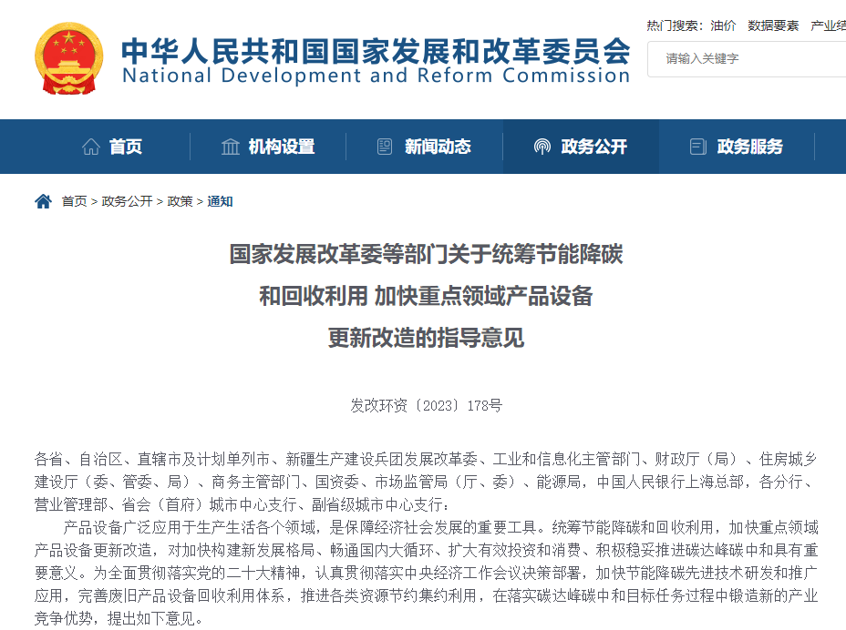 擴大產品設備更新改造有效需求 推動制造業高品質供給 助力實體經濟高質量發展 ——《關于統籌節能降碳和回收利用 加快重點領域產品設備更新改造的指導意見》解讀 中國國際工程咨詢有限公司 潘小海 產品設備作為日常生產生活中不可或缺的工具,是保障經濟社會發展的重要基礎,具有應用范圍廣、保有量大、能耗量高、再生資源蘊藏豐富等特點。近日,國家發展改革委等9部門聯合印發了《關于統籌節能降碳和回收利用 加快重點領域產品設備更新改造的指導意見》(發改環資〔2023〕178號,以下簡稱《指導意見》),對相關工作進行部署,明確了總體要求、工作目標和重點任務,有利于暢通國內大循環、加快發展方式綠色轉型、積極穩妥推進碳達峰碳中和、助推經濟社會高質量發展。 01 加快產品設備更新改造和回收利用是暢通國內大循環的重要手段 加快構建以國內大循環為主體、國內國際雙循環相互促進的新發展格局,是以習近平同志為核心的黨中央作出的重大戰略決策。去年底召開的中央經濟工作會議將著力擴大內需放在2023年重點工作任務首位。近期,習近平總書記在中央政治局第二次集體學習時強調,要搞好統籌擴大內需和深化供給側結構性改革,形成需求牽引供給、供給創造需求的更高水平動態平衡,實現國民經濟良性循環。 從經濟發展規律來看,大國經濟具有內需為主導的顯著特征。我國市場上的產品設備種類多、應用范圍廣,對促進國內消費、帶動經濟增長具有重要作用,是實施擴大內需戰略的重要著力點。僅以家用電器為例,有關行業協會數據顯示,我國主要家用電器保有量已超過20億臺,2021年家用電器市場規模達8811億元,家用電器行業規模以上企業營業收入1.7萬億元。 《指導意見》首批聚焦鍋爐、電機、電力變壓器、制冷、照明、家用電器等6類產品設備,多措并舉支持企業開展更新改造,推動淘汰低效落后產品設備,加強節能降碳先進技術推廣應用,完善廢舊產品設備回收利用體系。相關舉措有助于發揮我國超大規模市場優勢,孕育不同領域、不同層次、不同群體對高效節能產品設備的有效需求,帶動設計、生產、應用、回收、處置全鏈條發展,帶動產業投資,增加就業崗位,進一步激發國內市場巨大活力。 暢通國內大循環離不開需求側消費牽引,也需要供給側提質升級?!吨笇б庖姟肪o緊扭住深化供給側結構性改革這條主線,提出發展一批高效節能產品設備生產骨干優勢企業及生產制造集聚區,通過強化財政、稅收、金融等政策支持,引導企業優化產品結構,提升高效節能產品設備市場供給,筑牢產品設備消費升級基礎。相關舉措將推動產品設備供需兩側有機結合,以高效節能產品的消費需求倒逼供給,以高品質供給驅動消費需求,形成供需良性循環和動態平衡。 02 加快產品設備更新改造和回收利用是積極穩妥推進碳達峰碳中和的必然選擇 節能是最直接、最有效、最經濟的降碳舉措;循環經濟以“減量化、再利用、資源化”為原則,與節能降碳具有顯著的協同效應;兩者都是實現碳達峰碳中和目標的重要途徑。我國重點領域產品設備節能降碳更新改造潛力巨大。以鍋爐為例,截至2021年底,我國各類鍋爐保有量約35萬臺,碳排放量占比較高。據測算,工業鍋爐平均運行熱效率提高5個百分點、電站鍋爐平均運行熱效率提高0.5個百分點,可實現年節能量約3000萬噸標準煤。同時,廢舊產品設備蘊藏著豐富的鐵、銅、鋁、鉛、鋅等再生金屬資源,是巨大的“城市礦產”,回收利用價值高。 《指導意見》的突出特點,是堅持產品設備更新改造和回收利用齊頭并進?!吨笇б庖姟仿鋵嵢婀澕s戰略,一手抓前端產品設備更新改造,一手抓后端回收利用體系建設,著力打通生產、使用、更新、淘汰、回收利用全鏈條。相關舉措將推動節能降碳從單個環節、部分領域轉向全流程系統發力,使資源節約滲透到產品設備生產、消費、回收利用的每一個環節,實現能盡其用、物盡其用,從而為積極穩妥推進碳達峰碳中和提供有力支撐。 03 加快產品設備更新改造和回收利用將為發展方式綠色轉型注入強大動能 一方面,《指導意見》關注當前,首批聚焦實施條件相對成熟、示范帶動作用較強的6類產品設備,以《重點用能產品設備能效先進水平、節能水平和準入水平(2022年版)》和現行能效強制性國家標準為基本依據,率先推動更新改造和回收利用。另一方面,《指導意見》著眼長遠,提出將及時總結工作成效和可行模式,逐步擴大更新改造范圍。根據產業發展階段和技術進步,實行能效水平動態轉化,不斷完善產品設備能效和淘汰標準。此外,《指導意見》提出要加強關鍵共性技術研發,推動形成一批具有自主知識產權和核心競爭力的節能降碳先進技術,有利于突破節能降碳、資源循環利用先進技術和產品供給的堵點、卡點、脆弱點,提高生產制造和回收利用產業發展水平,在落實碳達峰碳中和目標任務過程中鍛造新的產業競爭優勢。 總的看,《指導意見》以產品設備更新改造和回收利用為切入點,統籌當前與長遠,兼顧節能降碳與經濟增長,將推動走出一條資源消耗做“減法”、經濟發展做“加法”的新路子。作為一名長期在節能降碳領域奮戰的咨詢工作者,我相信《指導意見》的出臺,將進一步凝聚各方力量,開創產品設備更新改造和回收利用協同發力新局面,為暢通