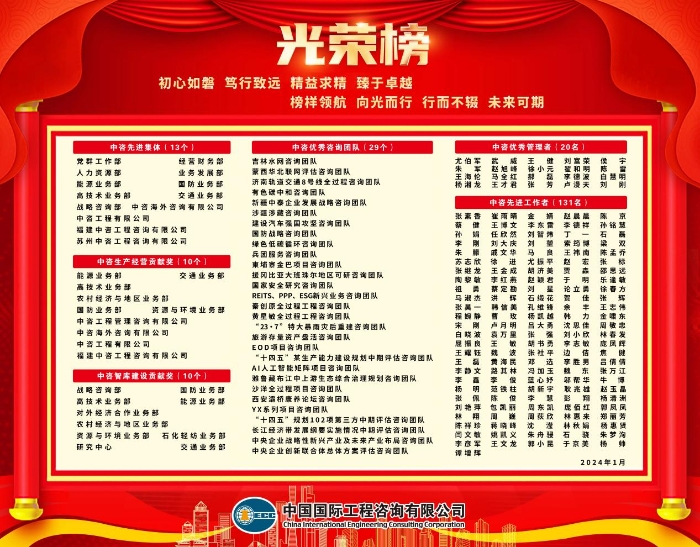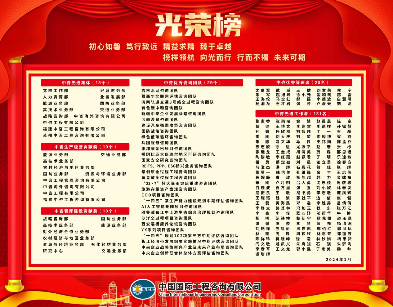 會議指出,2023年,公司深入開展習近平新時代中國特色社會主義思想主題教育,堅定不移落實“五五戰略”,加快建設國家高端智庫和世界一流咨詢機構,在服務中央科學決策和國家重大戰略方面做出突出貢獻,核心功能和核心競爭力更加凸顯,圓滿完成國資委各項考核指標。公司咨詢服務工作得到委托方高度認可,收到中央部委、地方政府、大型企事業單位等各方感謝信240封,100多名個人和團隊受到表揚。公司榮獲菲迪克“卓越工程項目獎”“優秀工程項目獎”各1項、魯班獎4項、國家優質工程獎9項,獲得“2023年度誠信經營守信踐諾標桿企業”榮譽稱號。