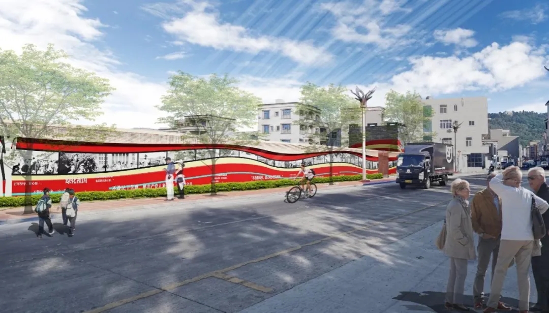 項目組通過調研發現,主要居民點西北側主入口沿街兩側風貌較差,于是,他們腦洞大開,通過給街道“老墻上新妝”,巧妙地將黨建文化建設與村容村貌提升工作相結合,突顯地方黨建特色。同時深入挖掘東山紅色文化,選取谷文昌同志在東山植樹造林防風治沙的偉大事業與鄉村振興的實踐工作為題材,將澳角村地方黨建事跡、特色黨建文化融入黨建墻設計,提升文化在地性;優化行道樹及周邊綠地植物配置,為澳角村道路提升提供良好示范。