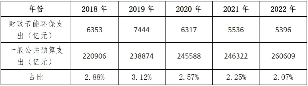 雙碳”目標(biāo)下綠色財政支出政策研究 姜楠楠 陳少強(qiáng) 財政是國家治理的基礎(chǔ)和重要支柱,生態(tài)環(huán)境作為居民生活最重要的公共產(chǎn)品之一,因其外部性特征向來是財政資金支持的重點(diǎn)領(lǐng)域。特別是黨的十八大以來,黨中央高度重視生態(tài)文明建設(shè)發(fā)展,提出了一系列具有重大影響和深遠(yuǎn)意義的新理念、新思想、新戰(zhàn)略,財政部門綜合運(yùn)用財政補(bǔ)貼、專項資金、轉(zhuǎn)移支付、政府采購等方式協(xié)同推進(jìn)生態(tài)環(huán)境質(zhì)量提升。2020年9月,中國提出二氧化碳排放力爭在2030年前達(dá)到峰值,努力爭取2060年實(shí)現(xiàn)碳中和的“雙碳”目標(biāo),綠色財政支出持續(xù)發(fā)力,為我國“雙碳”目標(biāo)實(shí)現(xiàn)發(fā)揮了不可替代的作用。 一、“雙碳”目標(biāo)下的綠色財政支出特征 (一)綠色財政支出強(qiáng)度不斷提升 黨的十八大以來,財政一般公共預(yù)算支出中用于節(jié)能環(huán)保的財政支出規(guī)模保持平穩(wěn),占一般公共預(yù)算支出比重基本維持在2%-3%之間,持續(xù)支持污染防治、生態(tài)保護(hù)以及節(jié)能減排等項目。具體見下表1: 表1 2018年-2022年全國一般公共預(yù)算支出中節(jié)能環(huán)保支出及占比情況