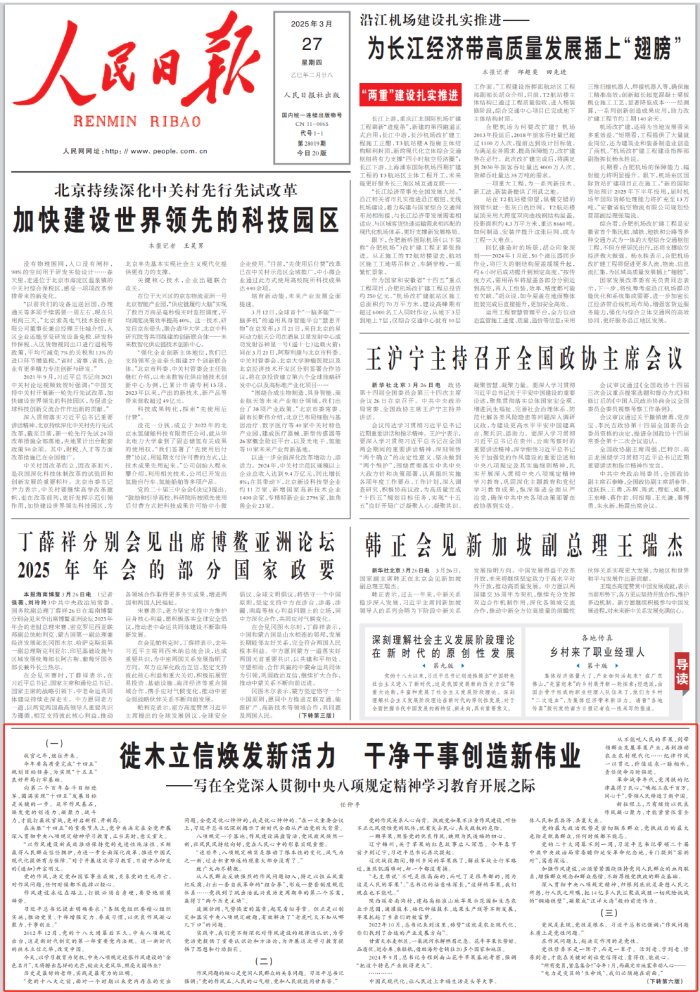 制定實施中央八項規(guī)定,這一新時代的徙木立信之舉,改變中國。今天,以學(xué)習(xí)教育為契機,中央八項規(guī)定這張作風(fēng)建設(shè)的“金色名片”,又將擦出怎樣的光芒,綻放大黨風(fēng)華,照亮大國偉業(yè)? (一) 收官之年,繼往開來。 今年要高質(zhì)量完成“十四五”規(guī)劃目標(biāo)任務(wù),為實現(xiàn)“十五五”良好開局打牢基礎(chǔ)。 向第二個百年奮斗目標(biāo)進軍,圓滿實現(xiàn)“十四五”發(fā)展目標(biāo)是關(guān)鍵的一步。筑牢作風(fēng)基石,煥發(fā)黨的創(chuàng)造力、凝聚力、戰(zhàn)斗力,才能打贏收官戰(zhàn),更好啟新程、開新局。 在決勝“十四五”的重要節(jié)點上,黨中央決定在全黨開展深入貫徹中央八項規(guī)定精神學(xué)習(xí)教育,正當(dāng)其時,意義重大。 “以作風(fēng)建設(shè)新成效推動保持黨的先進性純潔性、不斷贏得人民群眾信任擁護,為進一步全面深化改革、推進中國式現(xiàn)代化提供有力保障。”對于開展這次學(xué)習(xí)教育,日前中辦印發(fā)的《通知》開宗明義。 黨的作風(fēng),決定黨和國家事業(yè)成敗,關(guān)系黨的生死存亡。對作風(fēng)問題,任何時候都不能掉以輕心。 作風(fēng)建設(shè)永遠在路上,打鐵必須自身硬,要登絕頂莫辭勞。 習(xí)近平總書記提出明確要求:“各級黨組織要精心組織實施,推動黨員、干部增強定力、養(yǎng)成習(xí)慣,以優(yōu)良作風(fēng)凝心聚力、干事創(chuàng)業(yè)。” 2012年12月,黨的十八大閉幕后不久,中央八項規(guī)定出臺,這是新時代制定的第一部重要黨內(nèi)法規(guī)。這一新時代的徙木立信之舉,改變中國。 今天,以學(xué)習(xí)教育為契機,中央八項規(guī)定這張作風(fēng)建設(shè)的“金色名片”,又將擦出怎樣的光芒,綻放大黨風(fēng)華,照亮大國偉業(yè)? 歷史是最好的老師,實踐是最有力的證明。 “黨的十八大之前,面對一個時期以來黨內(nèi)存在的突出問題,全黨是憂心忡忡的,我是憂心忡忡的。”在一次重要會議上,習(xí)近平總書記深刻揭示了新時代全面從嚴(yán)治黨的大背景。 八項規(guī)定一子落地,作風(fēng)建設(shè)滿盤皆活,黨風(fēng)政風(fēng)煥然一新,社風(fēng)民風(fēng)持續(xù)向好,黨在人民心中的形象實現(xiàn)重塑。 “這些年,八項規(guī)定確實是推動了根本性的變化,風(fēng)氣為之一新,過去積重難返的現(xiàn)象大部分沒有了。” 致廣大而盡精微。 從人民群眾反映強烈的作風(fēng)問題切入,持之以恒正風(fēng)肅紀(jì)反腐,打出一套自我革命的“組合拳”,形成一整套制度規(guī)范體系……黨找到了跳出治亂興衰歷史周期率的第二個答案,贏得了“兩個歷史主動”。 波瀾壯闊、氣勢恢宏的篇章,起筆看似尋常。但正是以制定和落實中央八項規(guī)定破題,有效解決了“老虎吃天不知從哪兒下口”的問題。 實踐中,我們黨不斷深化對作風(fēng)建設(shè)的規(guī)律性認(rèn)識,為管黨治黨提供了重要認(rèn)識論和方法論,為開展這次學(xué)習(xí)教育提供了思想和行動指引。 (二) 作風(fēng)問題的核心是黨同人民群眾的關(guān)系問題。習(xí)近平總書記強調(diào):“黨的作風(fēng)正,人民的心氣順,黨和人民就能同甘共苦。” 黨的作風(fēng)關(guān)系人心向背。執(zhí)政黨如果不注重作風(fēng)建設(shè),聽任不正之風(fēng)侵蝕黨的肌體,就有失去民心、喪失政權(quán)的危險。 一顆蘋果,照鑒黨的優(yōu)良作風(fēng),映照為民造福的初心。 遼寧錦州,關(guān)于蘋果的紅色故事啟人深思。今年春節(jié)前夕到遼寧,習(xí)近平總書記再次提起。 遼沈戰(zhàn)役期間,錦州鄉(xiāng)間的蘋果熟了,解放軍戰(zhàn)士行軍路過,雖然饑渴難耐,卻一個都沒有摘。 “毛主席說‘不吃是很高尚的,而吃了是很卑鄙的,因為這是人民的蘋果’。”總書記的話意味深長,“這樣的蘋果,我們現(xiàn)在也不能吃。” 陜西延安南溝村,建起高標(biāo)準(zhǔn)山地蘋果示范園和生態(tài)農(nóng)業(yè)示范園,滴灌技術(shù)、矮化種植技術(shù)、選果生產(chǎn)線等不斷發(fā)展,蘋果托起了鄉(xiāng)親們的致富夢。 2022年10月,總書記來到這里,稱贊“這就是農(nóng)業(yè)現(xiàn)代化,你們找到了合適的產(chǎn)業(yè)發(fā)展方向”。 甘肅天水麥積區(qū),一渠洮河水解燃眉之急。花牛蘋果長勢好、品質(zhì)優(yōu),進冷庫、乘輕軌,借助海外倉銷往20多個國家和地區(qū)。 2024年9月,總書記專程到南山花牛蘋果基地考察,強調(diào)“把這個特色產(chǎn)業(yè)做得更大”。 ………… 中國式現(xiàn)代化,讓人民過上幸福生活是頭等大事。 從不能吃人民的蘋果,到帶領(lǐng)群眾發(fā)展蘋果產(chǎn)業(yè),再到推動農(nóng)業(yè)農(nóng)村現(xiàn)代化……紀(jì)律作風(fēng)一以貫之,價值追求一脈相承,責(zé)任使命與時俱進。 革命戰(zhàn)爭年代,黨用鐵的紀(jì)律贏得了民心,“喚起工農(nóng)千百萬,同心干”,帶領(lǐng)人民締造了新中國。 新征程上,只有繼續(xù)以優(yōu)良作風(fēng)凝心聚力,才能緊緊依靠全體人民和衷共濟、共襄大業(yè)。 黨的最大政治優(yōu)勢是密切聯(lián)系群眾,黨執(zhí)政后的最大危險是脫離群眾,任何時候都不能忘。 黨的二十大閉幕不到一周,習(xí)近平總書記帶領(lǐng)二十屆中共中央政治局常委瞻仰延安革命