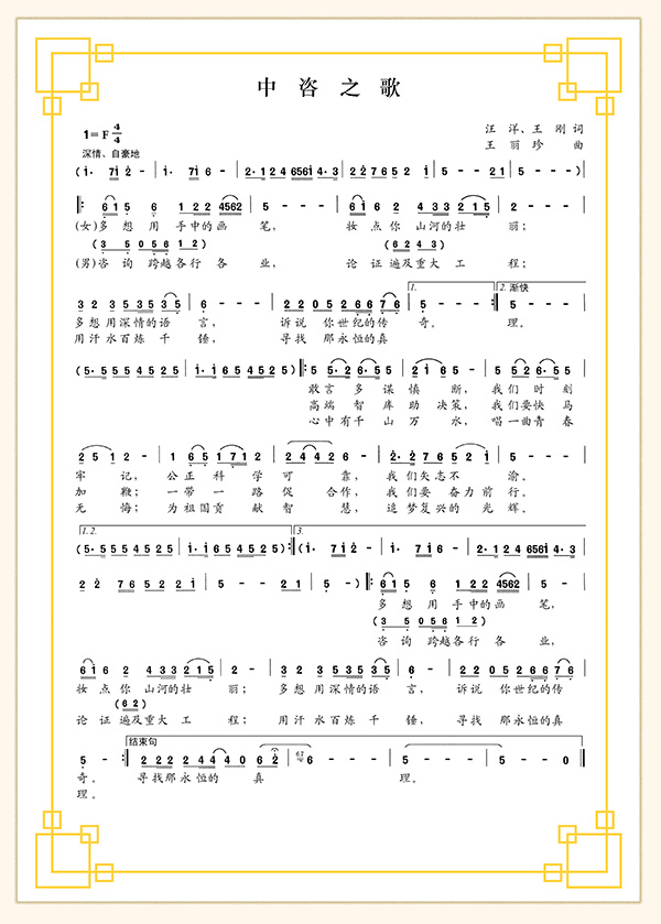 《中咨之歌》旋律優(yōu)美、抒情大氣,易上口傳唱,歌詞凝煉了公司服務(wù)國家、貢獻(xiàn)社會(huì)的歷史傳承,凸顯了新時(shí)期高端智庫建設(shè)的宗旨目標(biāo),展現(xiàn)了中咨人志存高遠(yuǎn)、矢志不渝、開拓創(chuàng)新、追夢筑夢的精神風(fēng)貌。曾獲得中國職工音樂家協(xié)會(huì)和國資委新聞中心聯(lián)合舉辦的2016中國職工好歌曲創(chuàng)作征集評(píng)選活動(dòng)“優(yōu)秀創(chuàng)作歌曲”表彰,并在權(quán)威雜志《歌曲》刊發(fā),中國曲譜網(wǎng)選登發(fā)表。