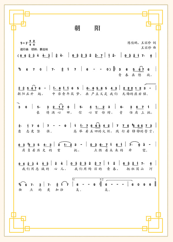 《朝陽》是一首青年人的歌曲,曲風(fēng)為進(jìn)行曲,堅(jiān)定豪邁、有力、朝氣蓬勃,體現(xiàn)了新一代中咨青年牢記囑托、砥礪前行,忠于理想、不斷進(jìn)取的精神風(fēng)貌,以堅(jiān)定的理想信念,勇立時(shí)代潮頭;以過硬的業(yè)務(wù)本領(lǐng),挑起時(shí)代重?fù)?dān);以飽滿的工作熱情,甘做時(shí)代激流。此曲被《中國曲譜網(wǎng)》登錄,此次創(chuàng)作是我公司為職工歌曲創(chuàng)作的一次展示,展現(xiàn)了廣大職工開拓創(chuàng)新、愛崗敬業(yè)、爭創(chuàng)一流的精神豐貌。